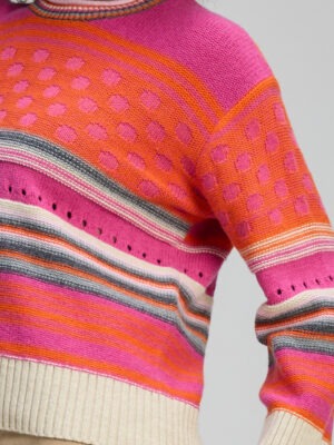 Stripe Pop Jumper (ZP8102) in Amaranth by Zaket & Plover. Featuring vibrant hues of hot pink and orange balanced with soft grey and cream neutrals, this statement knit showcases a fun mix of varied stripes and subtle polka-dot detailing for eye-catching dimension.