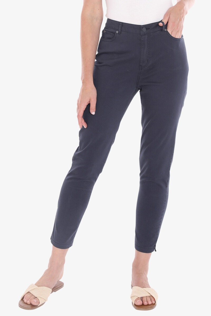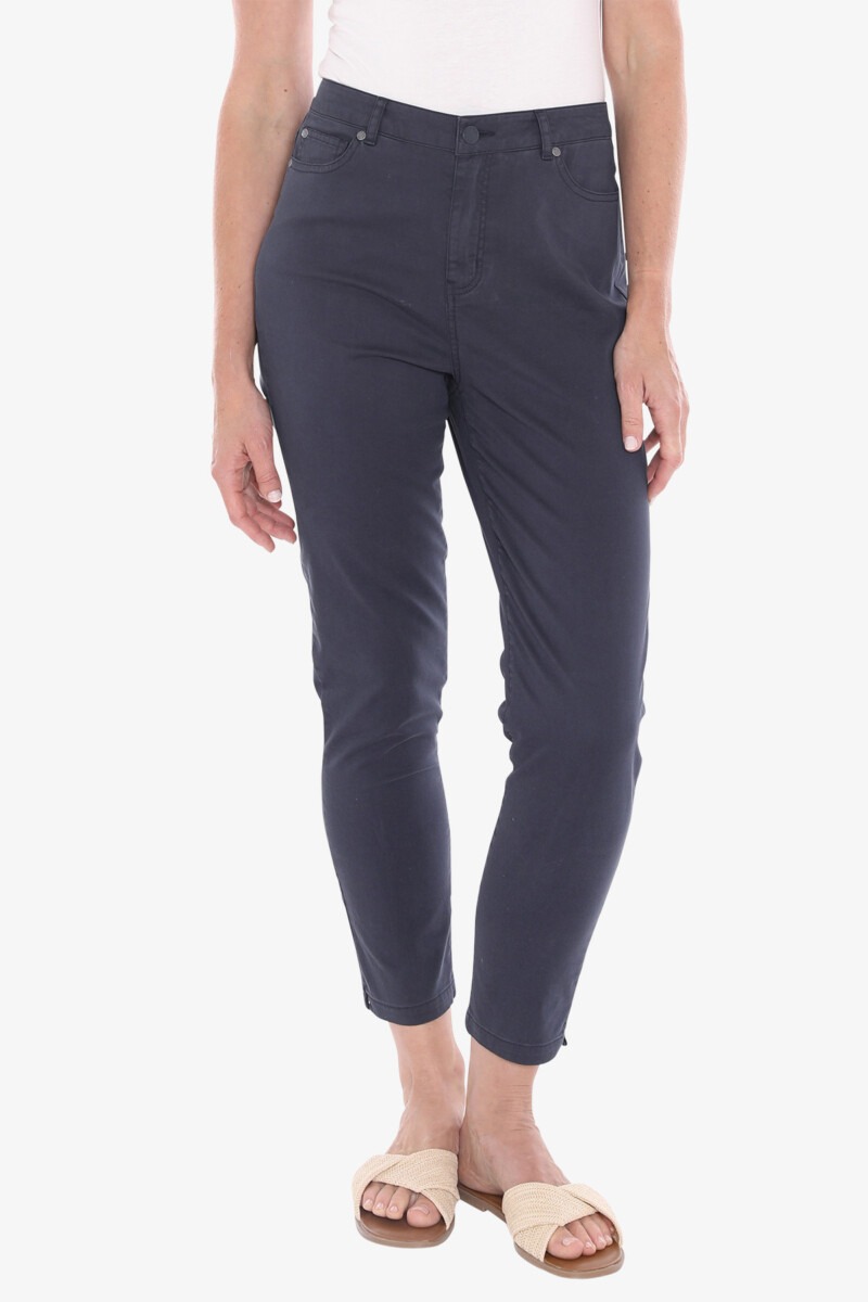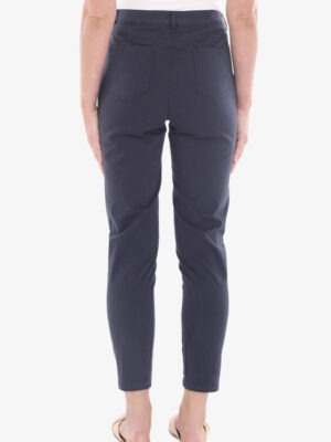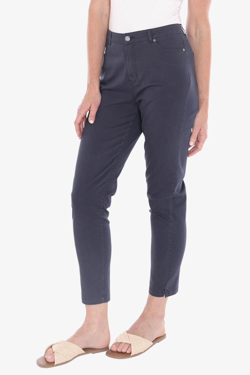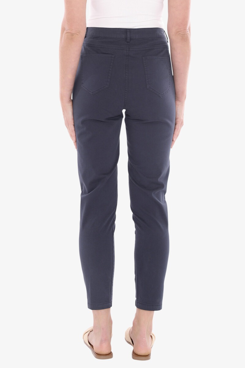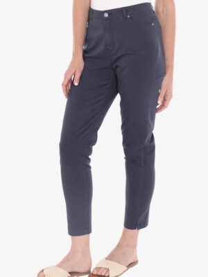 An on-trend brushed cotton jean style. In a classic navy colour. 5 Pocket Pant, straight leg, rivets and buttons dyed to match, ankle length, small side split on the hem.