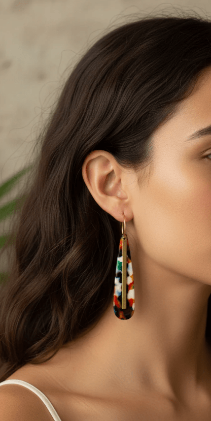 Bright, colourful statement earrings with bold gold band through the front. Pendant measures 5cm.