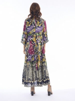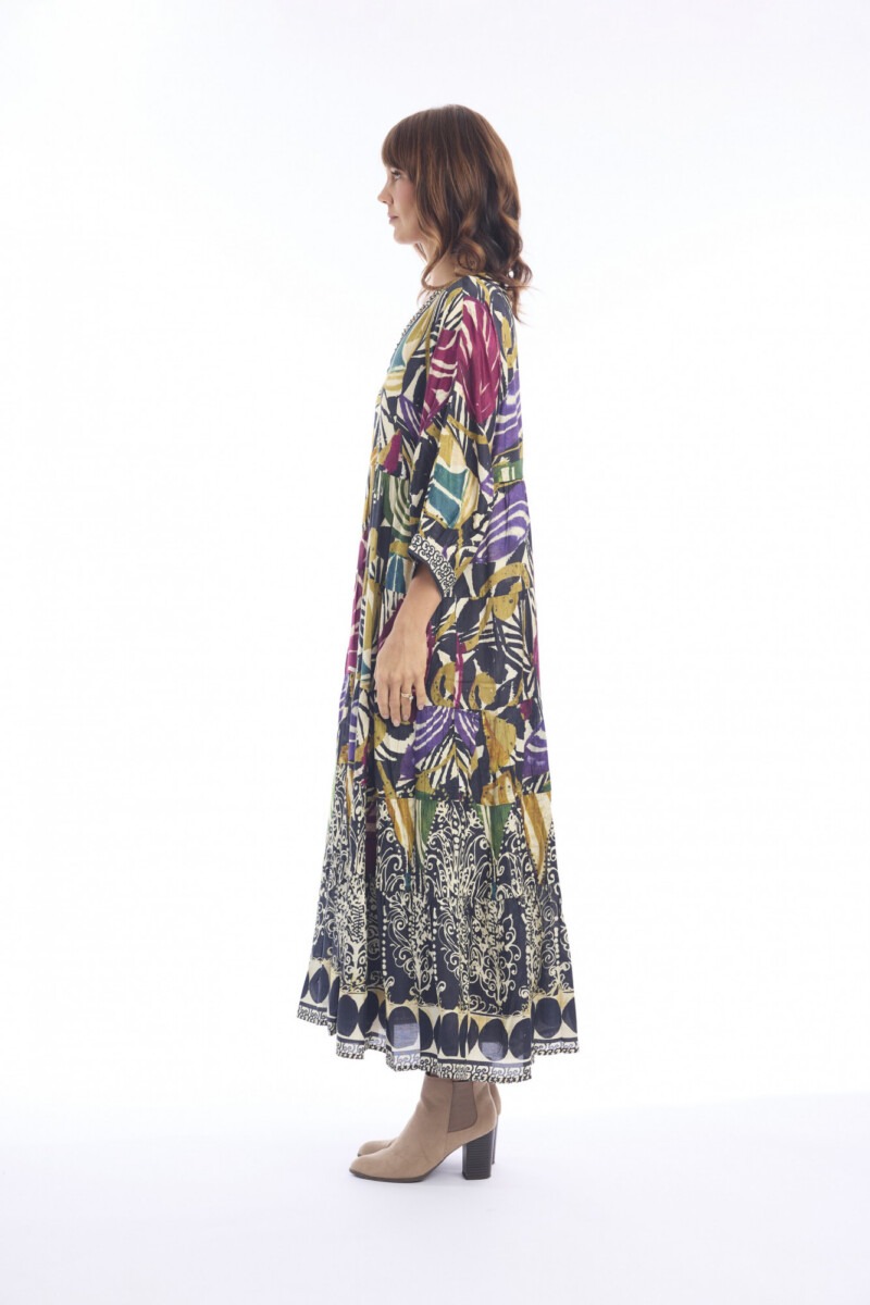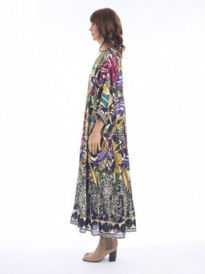 Effortlessly elegant, this maxi-length dress is crafted from 100% rayon for a soft, breathable feel. The relaxed A-line silhouette flows into tiered layers, creating graceful movement and a flattering drape. A V-neckline is accented with decorative embroidered trim and subtle bead or sequin embellishments, while the three-quarter sleeves feature gentle puffing at the shoulders and contrasting cuffs for added charm. Functional side patch pockets complete the look with practicality. Designed to transition seamlessly from casual outings to relaxed evenings, this dress combines comfort and style with ease.