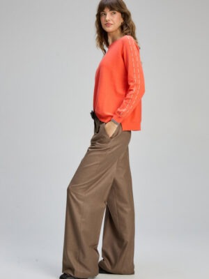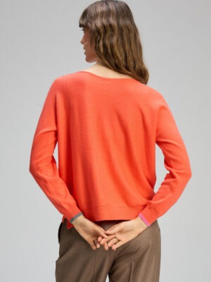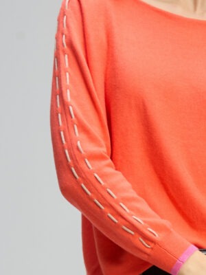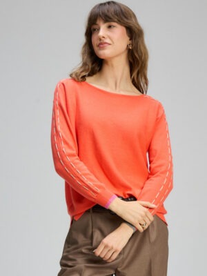 Cut in a relaxed fit with a flattering boat neckline, this jumper features eye-catching contrast threading running down each sleeve for a modern, playful edge. The striking melon orange base is elevated by mismatched cuff detailing; one hot pink, one deep green.