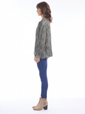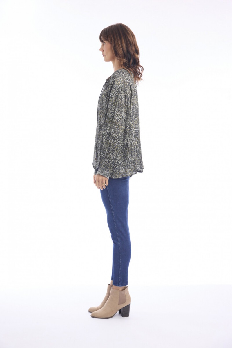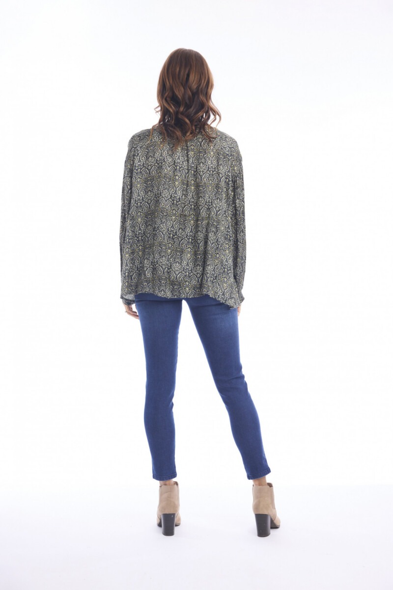 Bring effortless bohemian charm to your wardrobe with the Valetta Top Boho, crafted from 100% soft rayon. This hip-length blouse features a relaxed fit with a subtle gathered or peplum effect at the waist. Long bell sleeves flare gracefully towards the wrists, accented with gentle gathers, while the V-neckline with a delicate trim adds a refined touch. The rich paisley-inspired print in black, gold, and olive green makes this top a standout piece for casual or semi-dressy occasions.