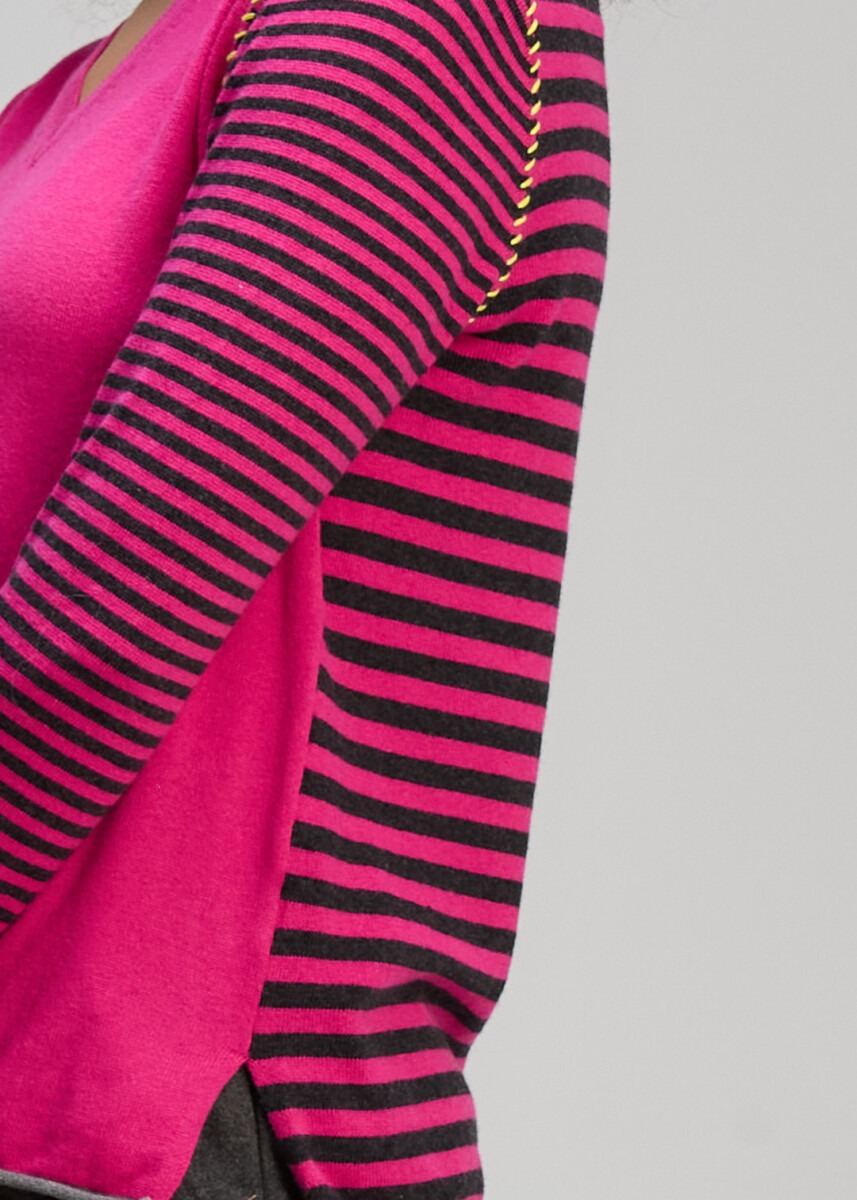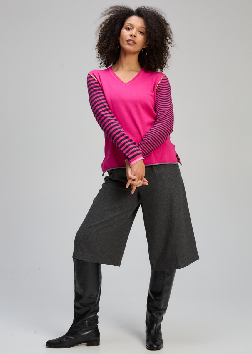 Bold yet beautifully wearable, the Varied Stripe V Essential in Magenta by Zaket & Plover brings playful contrast to an everyday classic. The vibrant magenta body is framed by finely striped sleeves, creating that signature Zaket & Plover clash that feels modern, confident and effortlessly chic.