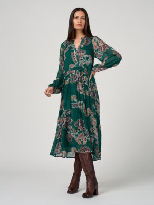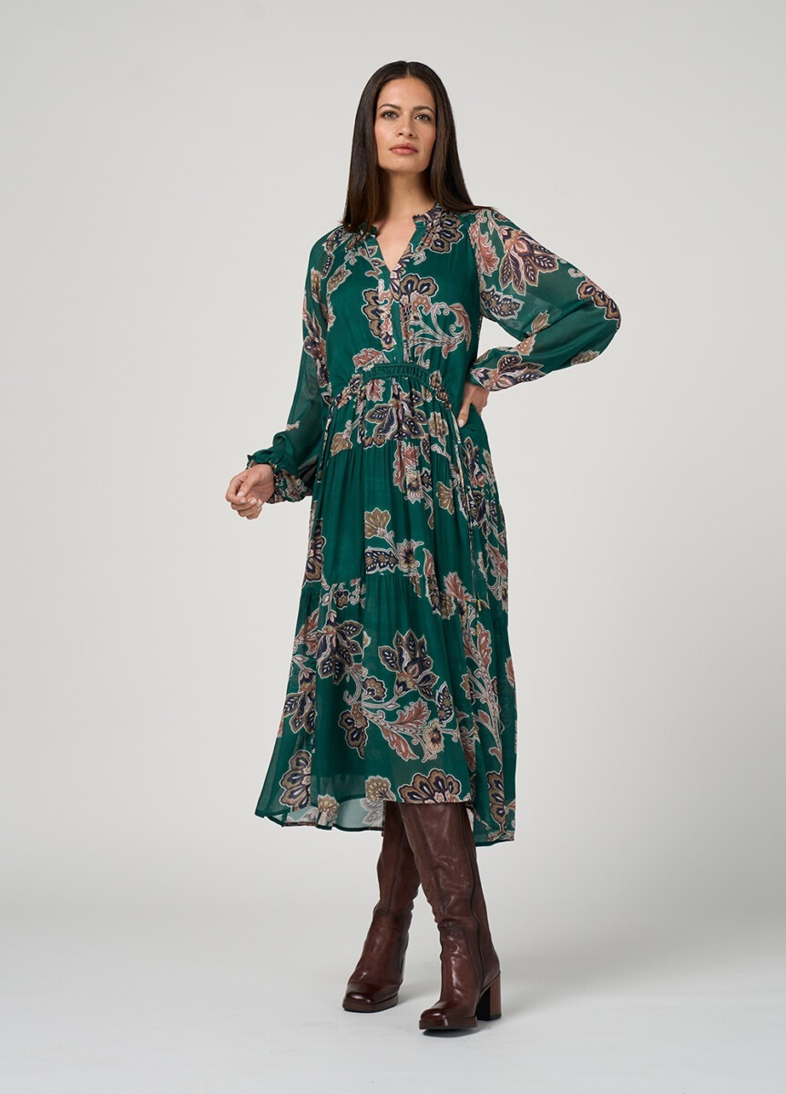 Sheer tiered midi dress featuring a ruffled neckline and a deep front placket, with drawstring detailing at the waist for adjustable shaping. Blouson sleeves with softly shirred elastic on the shoulders with elasticated cuffs. Fully lined.
