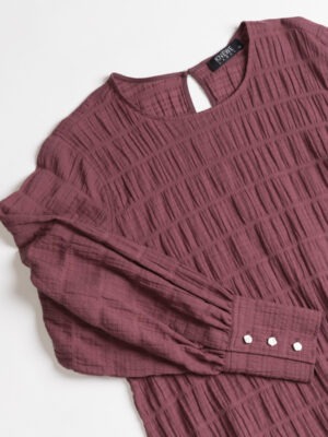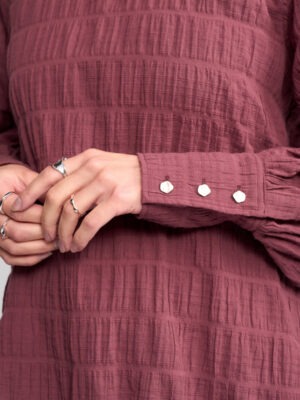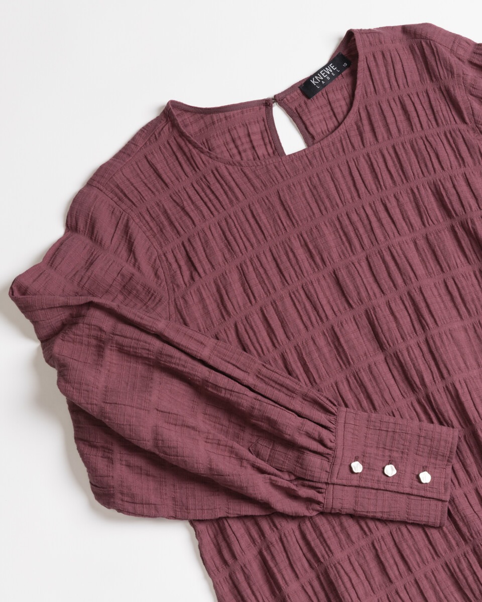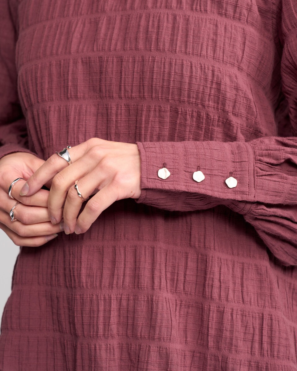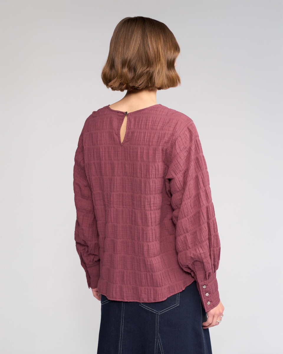 Long sleeve top crafted from a stretchy textured cotton fabric in Port, a light burgundy tone. Designed with a round neckline featuring a centre back keyhole with a metal hammered button and elastic loop fastening. Long sleeves are softly gathered into structured cuffs, finished with a bound placket and metal hammered buttons.