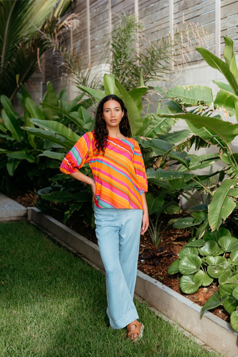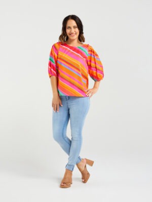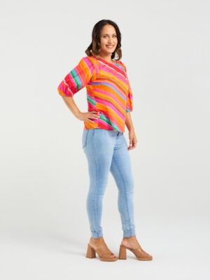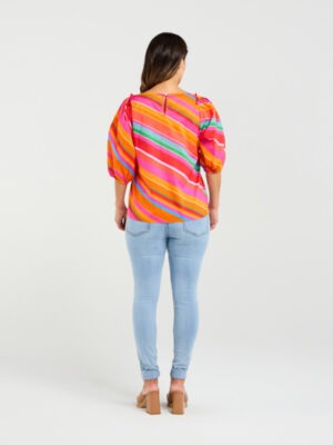 Bright and bold, this top features dynamic, colorful stripes that bring a playful energy to your wardrobe. Elasticated sleeves below the elbow are sewn with frill detail at the shoulder, while a round neckline with a button at the back makes it easy to slip on.