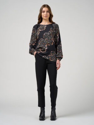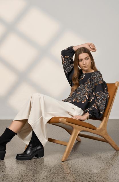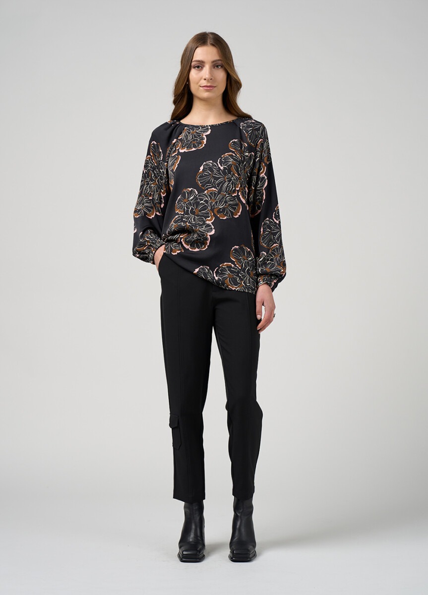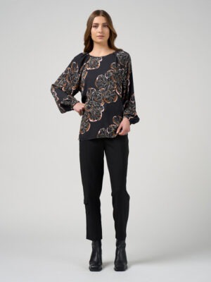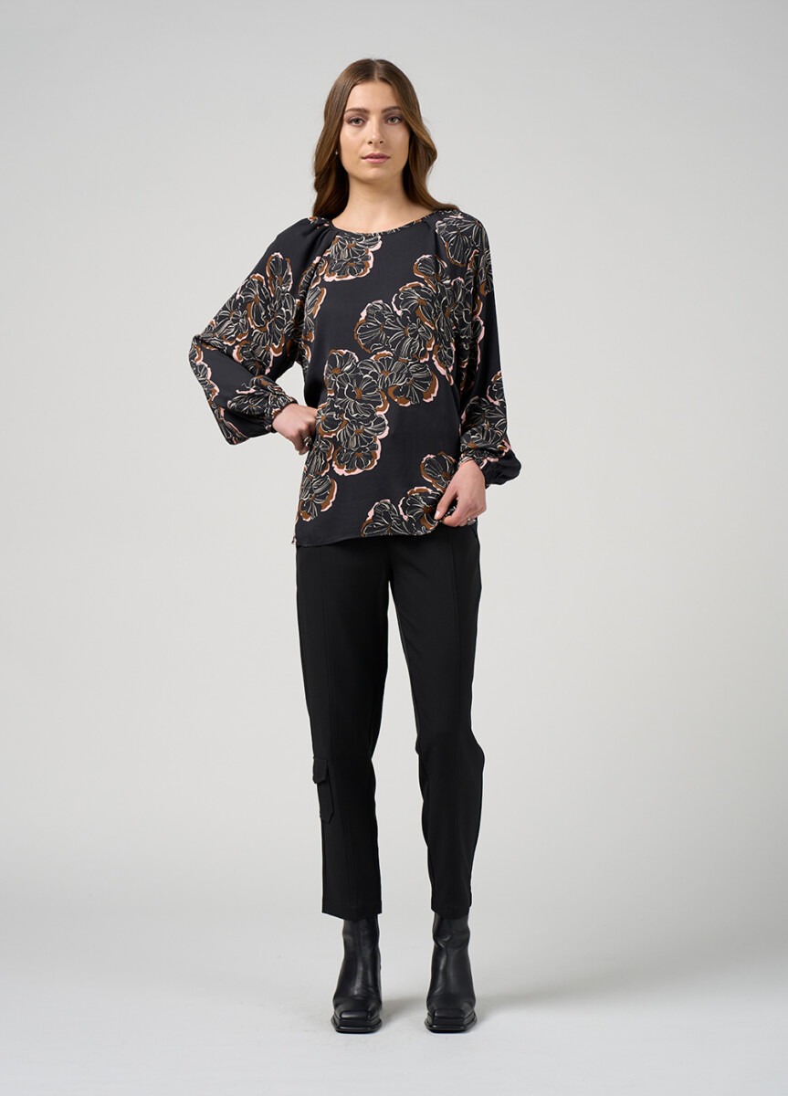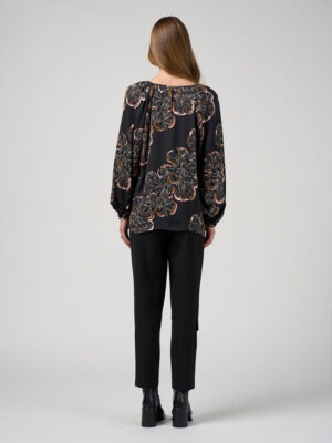The blouse features raglan sleeves with hidden tucks and softly gathered shoulders, creating gentle volume through the sleeve.